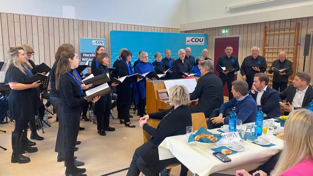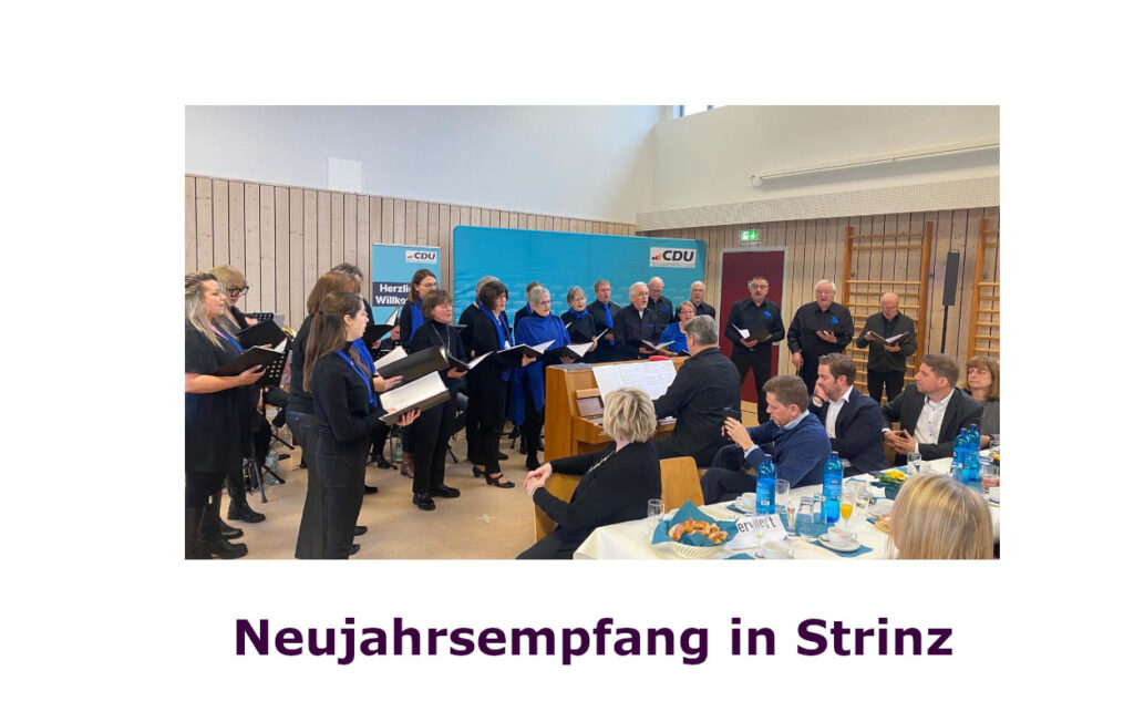 Der Einladung zu musikalischen Mitgestaltung des Empfangs, kamen wir mit unserem Chorleiter Michael Knopke gerne nach. Das DGH in Strinz war gut gefüllt, der Auftritt war super, wir waren über 20 Sängerinnen und Sänger und konnten das Publikum zuerst mit „Ich wollte nie erwachsen sein“ einstimmen und dann mit „Dorfkind“ richtig gute Stimmung erzeugen, so dass alle im Publikum mit geklatscht haben.